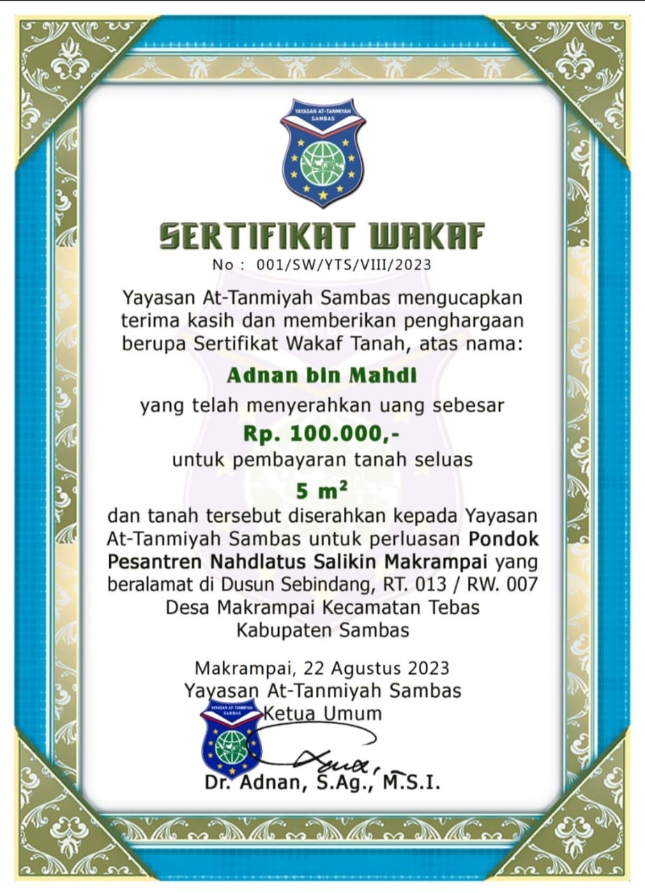 Bagi masyarakat yang berminat untuk berwakaf, silakan menghubungi pengurus pondok Nahdlatus Salikin